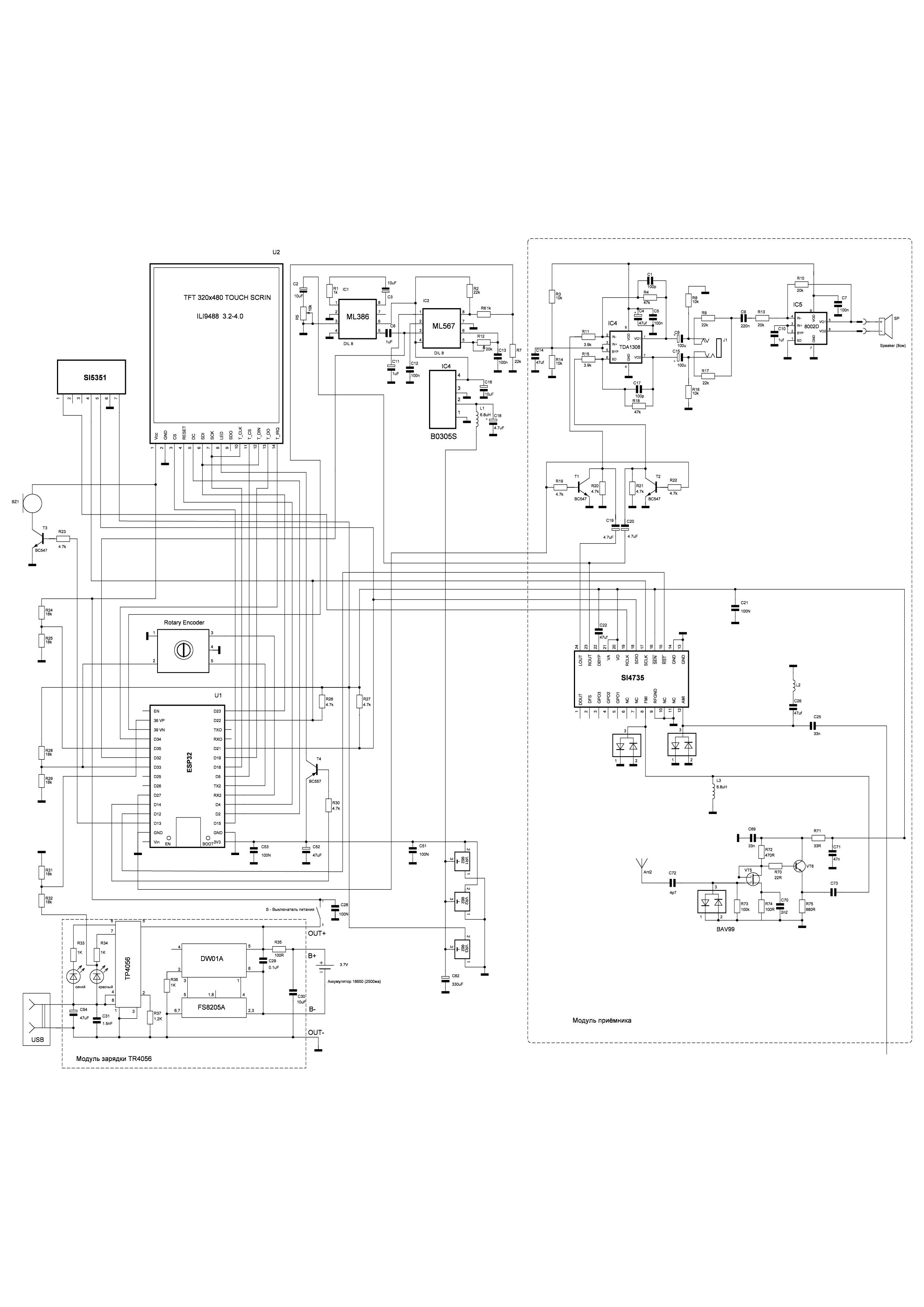 Изначальная идея - поместить данный приёмник в корпусе с размерами 38х88х110 мм, используя готовый корпус с Али. Дисплей TFT 4,0. Динамик 3W, 8ом (диаметр 77мм). Всё поместилось, ещё осталось пространство внутри для дальнейшего развития проекта. Делаю из чисто "спортивного интереса" - для души. В схеме нет ничего нового,практически многое заимствовано с данного форума - проверенные рабочие решения (но, возможны и ошибки). Буду очень признателен за анализ и замечания.